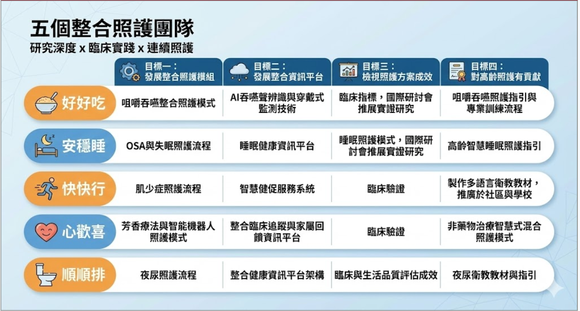 本計畫根據高齡者常見之健康功能問題,組成五個整合照護小組,分別聚焦於營養咀嚼吞嚥(好好吃)、睡眠(安穩睡)、行動(快快行)、認知心理(心歡喜)及泌尿(順順排)五大面向。各小組由跨專業成員組成,包含醫師、護理師、營養師、心理師、物理與職能治療師、語言治療師、社工師、各領域之專家學者等,負責發展並執行各功能面向之臨床照護流程與介入策略。