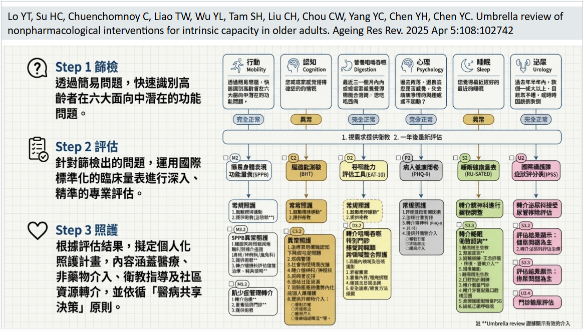 經實際試行六大健康功能面向之整合照護模組後,子計畫二團隊依據執行經驗持續優化照護內容,並融合團隊撰寫之傘型文獻回顧論文〈Umbrella review of nonpharmacological interventions for intrinsic capacity in older adults, 2025〉之實證研究成果,強化照護策略之科學基礎。此外,團隊導入服務使用者導向的設計思考理念,發展出涵蓋「六大功能健康面向的篩檢、評估、照護三階段流程的整合照護模板」,完整整合六大健康功能面向,協助臨床團隊更有效率且一致性地執行高齡者整合照護。