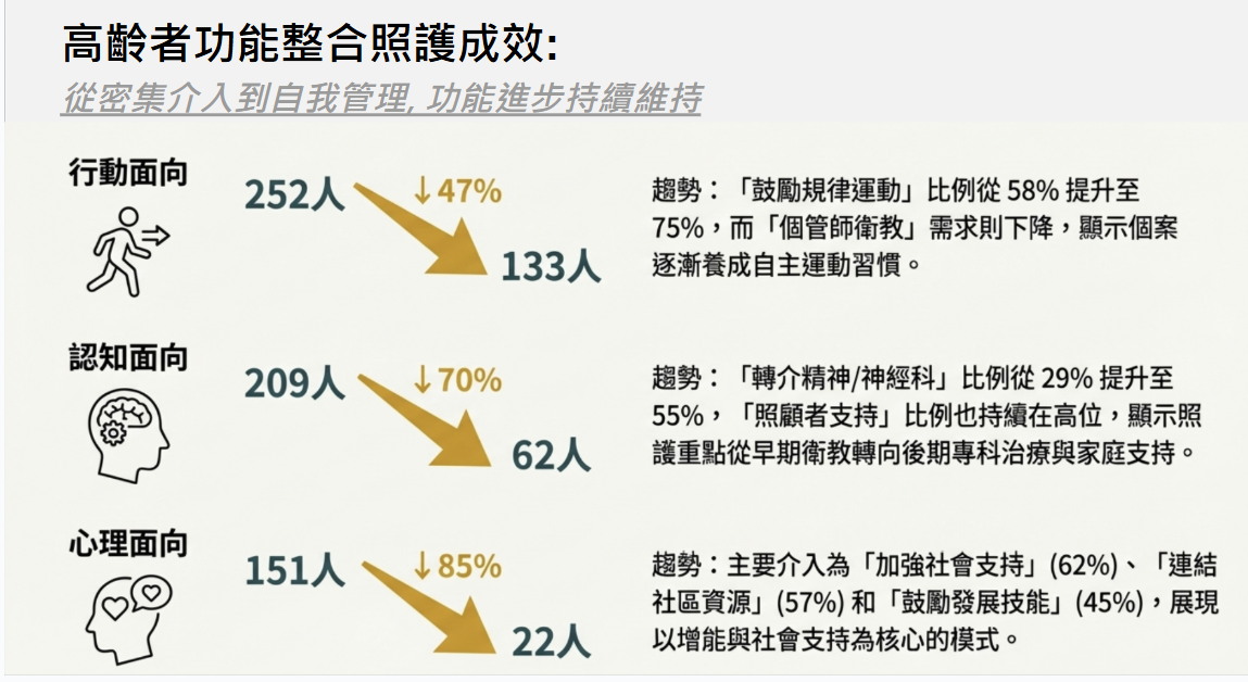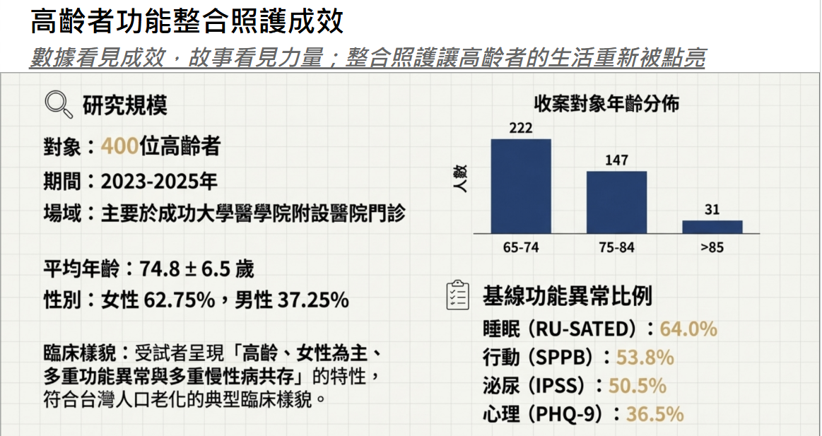 本研究收案對象呈現「高齡、女性為主、多重功能異常與多重慢性病共存」的特性,符合我國人口老化趨勢下的典型臨床樣貌。此樣本特徵充分反映整合照護模式之必要性,強調醫療、心理與生活層面之連結,以支持高齡者維持功能健康與生活品質。