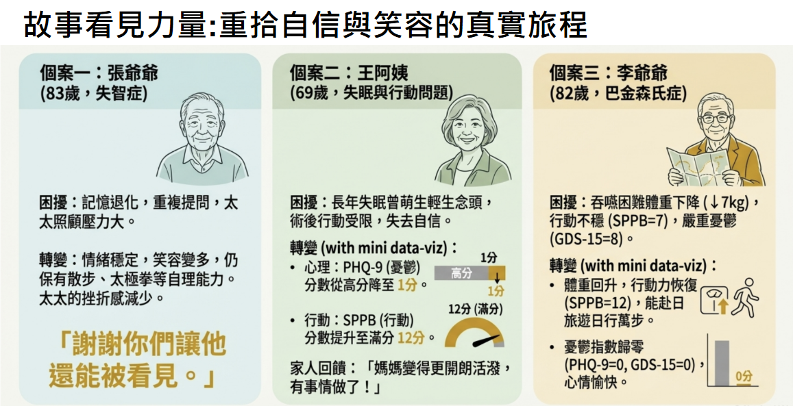 這三位長者的照護歷程,展現了高齡照護工作的真實樣貌──每一位個案的生命經驗、疾病歷程、家庭互動與社會角色都截然不同,個案的異質性高。因此,照護團隊並非採取制式化介入,而是依循「個別化照護(Individualized Care)」與「整合照護(Integrated Care )」的理念,透過跨專業合作(各專科醫師、營養師、物理/職能治療師、個管師),共同擬定最貼近個案生活脈絡的照顧計畫。