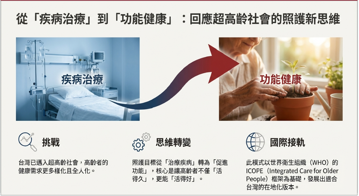 整合照護的導入不僅是醫療技術的升級,更是「醫療模式的轉譯」。當醫院願意從疾病導向走向「功能健康導向」,從臨床治療走向「全人支持」,整個團隊就會發現,照護不再只是治療,而是一場與高齡者同行、共創尊嚴與希望的旅程。