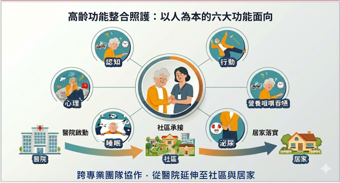 結合不同專科、不同專業成員,形成跨領域的專業團隊,透過醫院、社區、居家等各個不同場域的協作,運用篩檢、評估、照顧管理、跨團隊及跨場域處置介入,對高齡者的營養吞嚥、泌尿功能、睡眠健康、活動能力、認知、情緒、感官功能等,建構有效可行的多元整合照護模式。