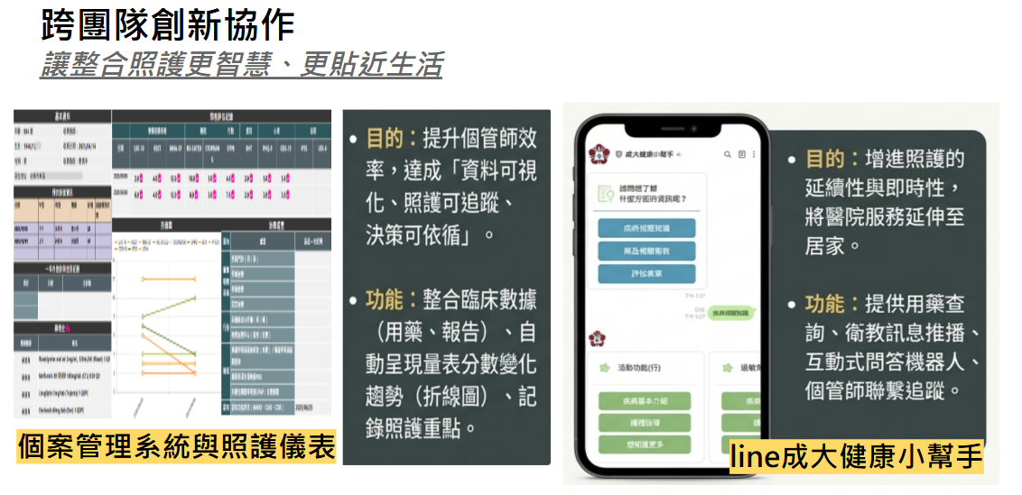 這些創新嘗試不僅促進跨專業團隊的交流,也讓整合照護不再侷限於醫療場域,而是延伸到社區與家庭生活,形成一個「科技支援、人本導向」的照護生態系,讓整合照護更智慧、更貼近生活,讓每一位高齡者都能「活得久,也活得好」。