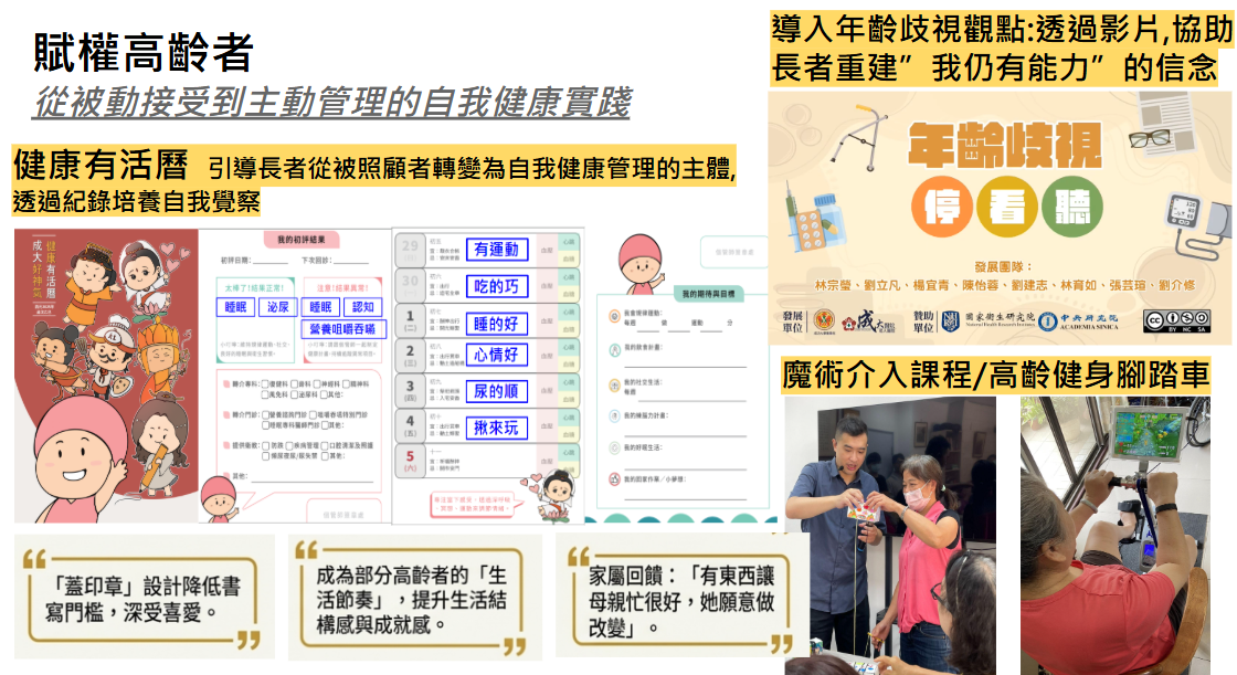 可借鏡「LINE成大健康小幫手」與「健康有活曆」的經驗,讓照護從醫院延伸到居家與社區。結合數位工具與紙本自我管理手冊,讓高齡者主動參與自身健康監測與生活管理,強化照護的持續性與自我效能。除此之外,也可考慮多加應用健康存摺並強化其功能,不只是記錄就醫和用藥,更要擴展到高齡者的核心功能評估,例如ICOPE的結果,並由高齡個管師館案並追蹤,也可提早發現新問題及早介入。