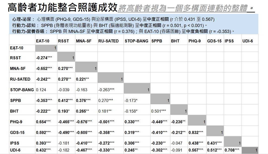 依基線量表分數進行相關分析,多數量表之間呈現統計的顯著相關性,顯示六大功能構面並非彼此獨立,而是具有一定程度的相關性。同一構面內中各量表,相關性最高,如心理構面中,PHQ-9 與 GDS-15 呈高度正相關(r = 0.83,p < 0.001);泌尿構面中,IPSS 與 UDI-6 也具有正相關(r = 0.71,p < 0.001)。