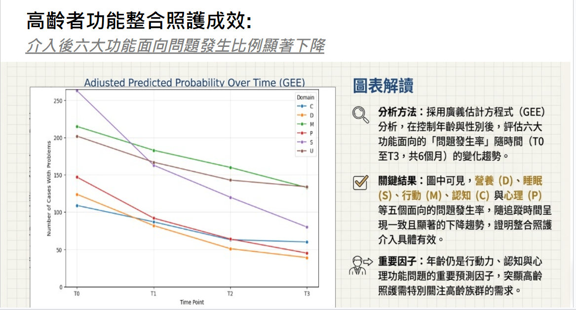 廣義估計方程式分析結果呈現出多數構面在追蹤期間均有一致且顯著下降趨勢,反映介入或追蹤過程中整體的功能改善。但是,年齡仍是行動、認知與心理構面之問題累積的重要預測因子,顯示未來高齡照護的規畫需要特別重視高齡族群的需求進行設計及介入。在六大構面有問題的參與者均隨時間的變化,可見所有構面有問題的人數均隨時間下降,與統計分析結果一致。