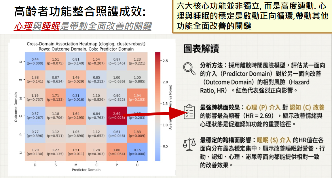 不同構面之間呈現中度相關性,**「心理健康」與「營養狀態」**是連動性最強的跨功能指標,顯示憂鬱和營養不良在高齡者中常相伴而生,需要組成跨專業團隊共同介入。**「行動力」與「認知功能」**之間存在顯著關聯,證實身體活動對於維持大腦健康至關重要。整體而言,各構面間普遍呈現輕度至中度相關性,僅少數組合(如認知與泌尿)呈現較弱相關。這些結果提供了重要的實證基礎,支持「功能健康導向」的整合照護模式,強調臨床人員不能單一處理某個症狀,而必須將高齡者視為一個多構面連動的整體。