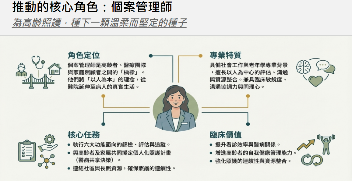個案管理師為整合照護的核心角色,建議醫院可配置受過高齡照護、護理或社會工作訓練之專責個管師,並導入「個案管理系統與照護儀表板」,以串聯病歷、用藥、量表、追蹤紀錄等資料,讓醫療決策更即時、完整。