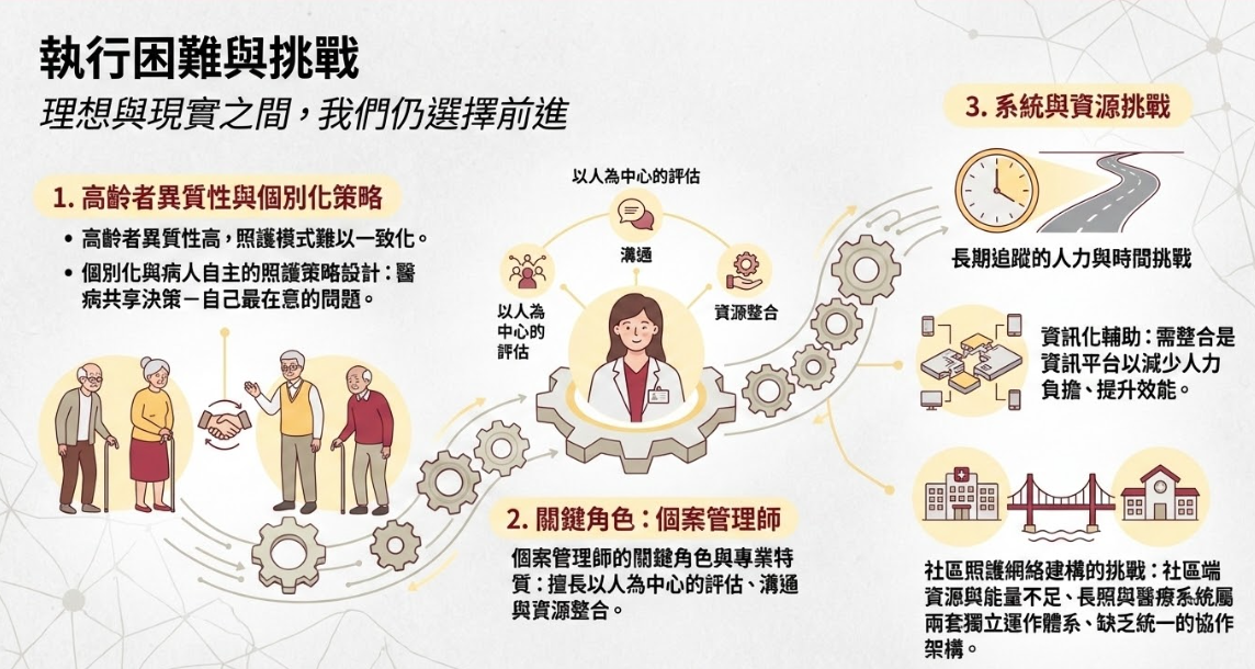這三位長者的照護歷程,展現了高齡照護工作的真實樣貌──每一位個案的生命經驗、疾病歷程、家庭互動與社會角色都截然不同,個案的異質性高。因此,照護團隊並非採取制式化介入,而是依循「個別化照護(Individualized Care)」與「整合照護(Integrated Care )」的理念,透過跨專業合作(各專科醫師、營養師、物理/職能治療師、個管師),共同擬定最貼近個案生活脈絡的照顧計畫。
