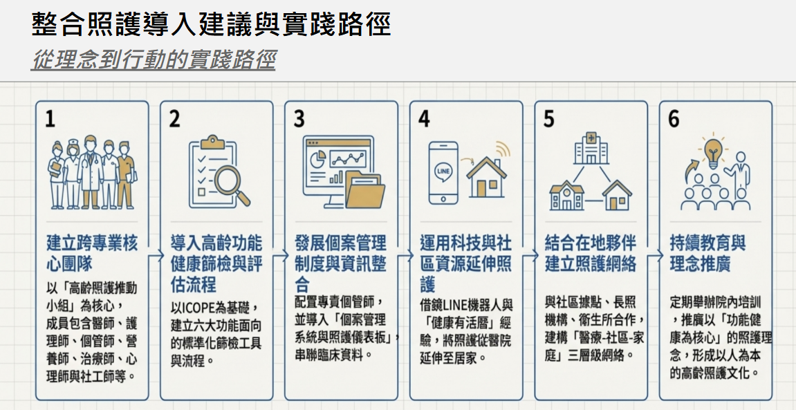 整合照護不僅是一套流程,更是一種文化。建議醫院定期舉辦院內培訓與工作坊,推廣以「功能健康為核心」的照護理念,讓臨床人員能以同理心與整合思維看待高齡病人,逐步形成以人為本的高齡照護文化。